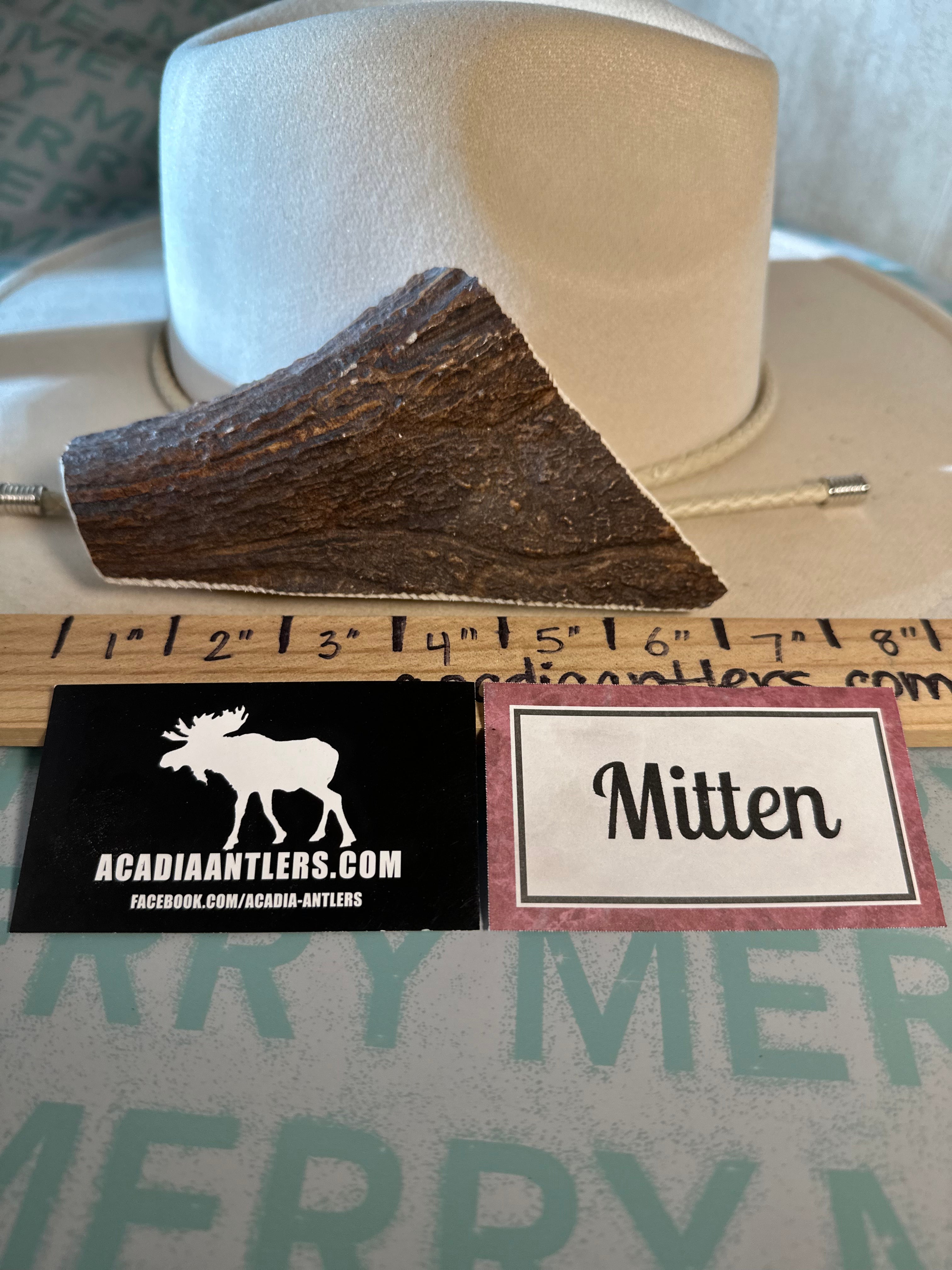 If you have a dog that needs a chewing challenge, and may not know what shape to purchase, consider a slab cut. A slab cut is cut from the yummy paddle of the moose antler (flat part), and will gradually be ground down -- This piece is called MITTEN, geared for a M dog.